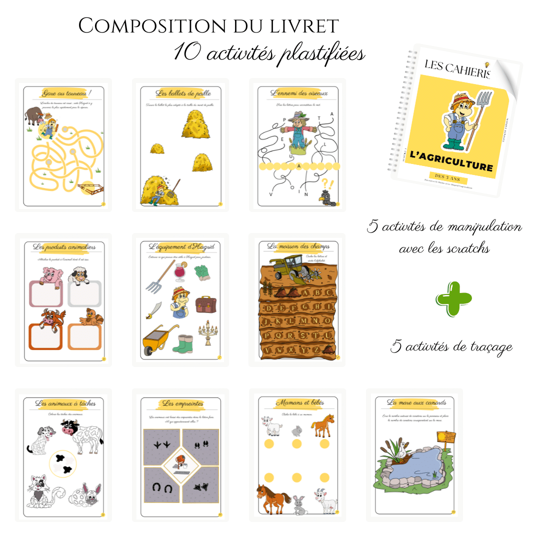Ce livret d’activités pour enfant plonge dans l’univers de l’agriculture.  Embarquez en suivant les aventures d’Hagrid l’agriculteur et des animaux de la ferme et aidez-le à travers 10 activités sur ce thème : 5 activités de manipulation avec des éléments à scratchs repositionnables et 5 activités de traçage.